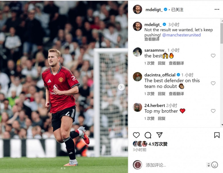德里赫特此役為曼聯(lián)踢滿全場(chǎng),賽后他在社交媒體上寫道:“這不是我們想要的結(jié)果,讓我們繼續(xù)努力!”